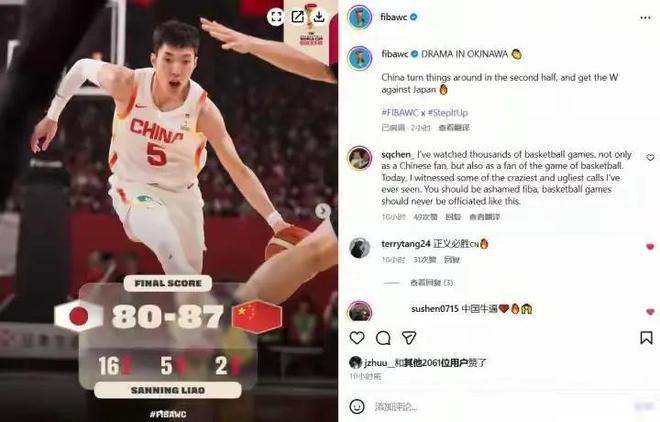 比赛结束后,FIBA官方账号发文,用“sneaky win”来形容中国男篮的胜利。